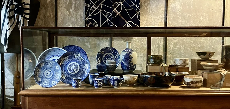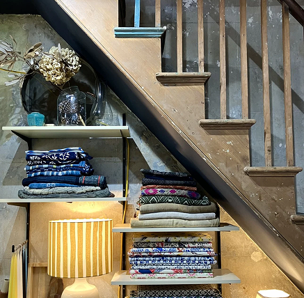 Antique and vintage pieces on display. Different textiles and fabrics in the shop.